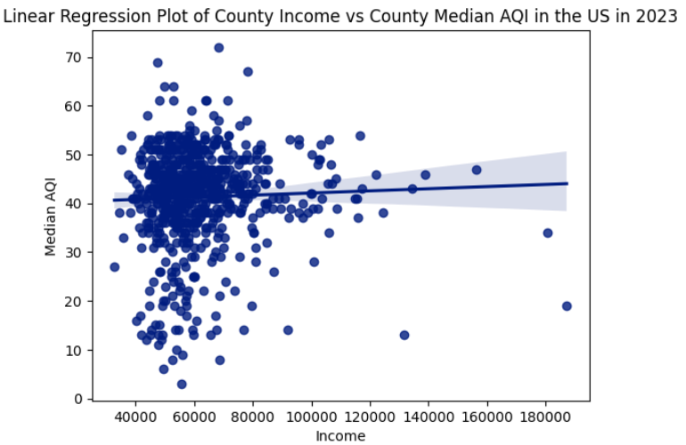 We compared the AQI with the annual income of people in counties across the US in 2023. We thought that there would be a moderate inverse relationship between income and air quality, since people with more economic resources have more options to live in areas with less pollution than individuals who have less finanical assets.