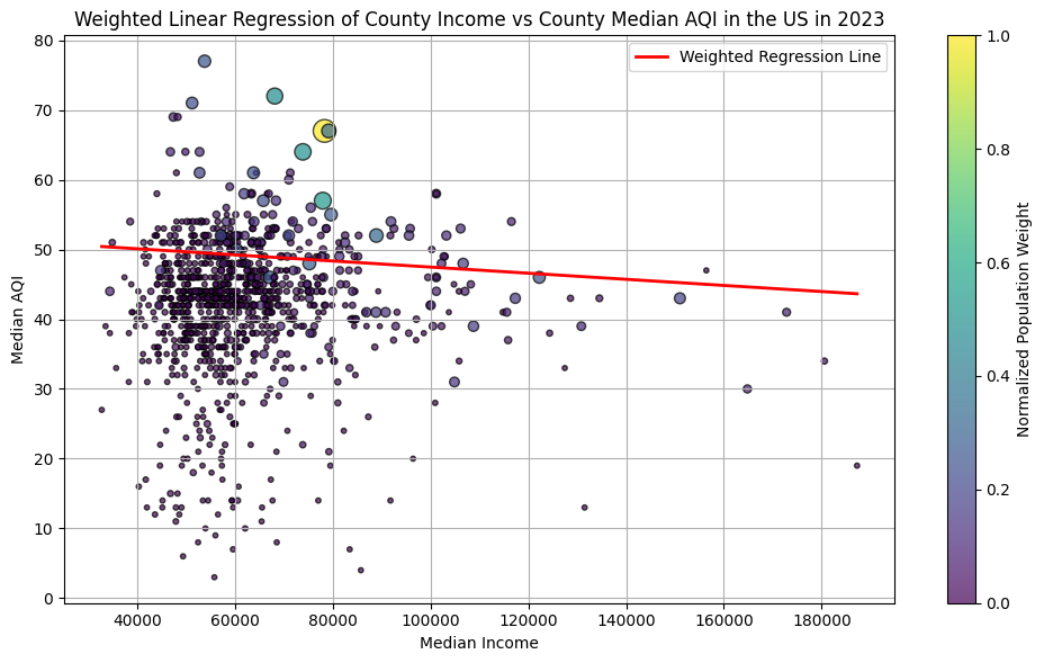 After creating a weighted regression model with the weight set to the populations of the counties, we produced a new graph. Along with fixing some issues earlier with the comprehensive dataset (we recovered 200 extra rows of information), our new correlation value became -0.0878, signifying a very weak correlation between income and median AQI. While this outcome does not fully match our original hypothesis of a moderate inverse relationship, it certainly was a lot closer than our first result.