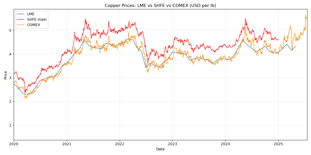 Copper is traded on several international futures exchanges. While prices generally move together, local factors (like tariffs) can create divergence. In this project, we investigate whether short-term COMEX (New York, United States) copper prices can be predicted using historical price patterns and information from other exchanges like SHFE (Shanghai, China) and LME (London, England).