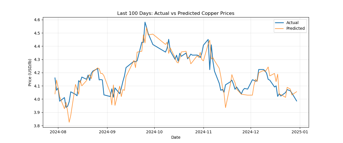 We chose to use XGBoost, a gradient-boosted tree model, for its ability to handle nonlinear, tabular (data that is structured into rows and columns) and time series features well. We used 80% of the data for training and 20% for testing, selected randomly. The model was trained to predict the next day’s COMEX copper price, using only past information.
