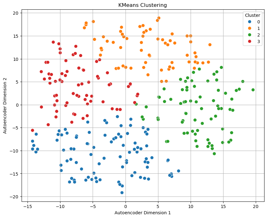 This plot visualizes the results of applying K-Means clustering on a 2D representation of the data generated using an autoencoder, a type of neural network used for unsupervised dimensionality reduction. The axes represent the compressed features learned by the autoencoder (Dimension 1 and Dimension 2), and each point represents a data sample. The colors correspond to the four clusters (0 to 3) identified by the K-Means algorithm.
