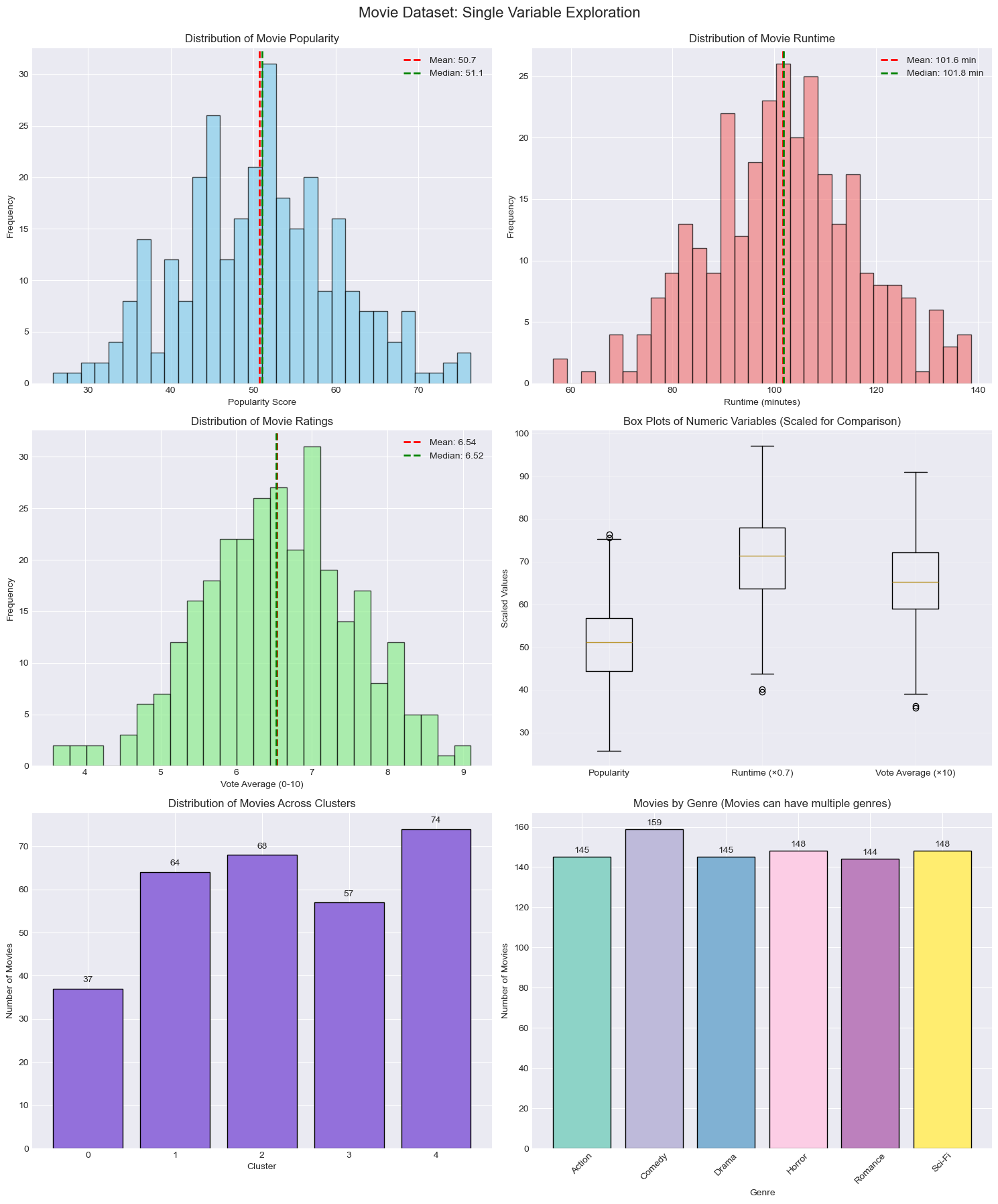 These plots showcase our exploratory data analysis (EDA) to understand the structure and distribution of the movie dataset before building a recommendation system. The univariate distributions in the top row such as histograms of popularity, runtime, and vote average, reveal roughly normal distributions with slight skewness, suggesting that most movies cluster around the mean values, but outliers exist. Key summary statistics like the mean and median are overlaid to indicate central tendency, helping us assess skewness and symmetry. The box plot in the top right compares the spread (interquartile range) and presence of outliers across the three numeric variables, using scaled values to enable direct comparison. The bottom left bar chart displays the distribution of movies across five unsupervised clusters, likely generated using a clustering algorithm such as K-Means, showing how the dataset groups based on feature similarity. Finally, the bottom right bar plot shows a frequency count of movie genres, giving insights into categorical variable distribution and genre diversity in the dataset. These EDA techniques — including data visualization, summary statistics, and pattern identification — provide crucial context for understanding variable relationships and preparing the data for similarity-based recommendations.