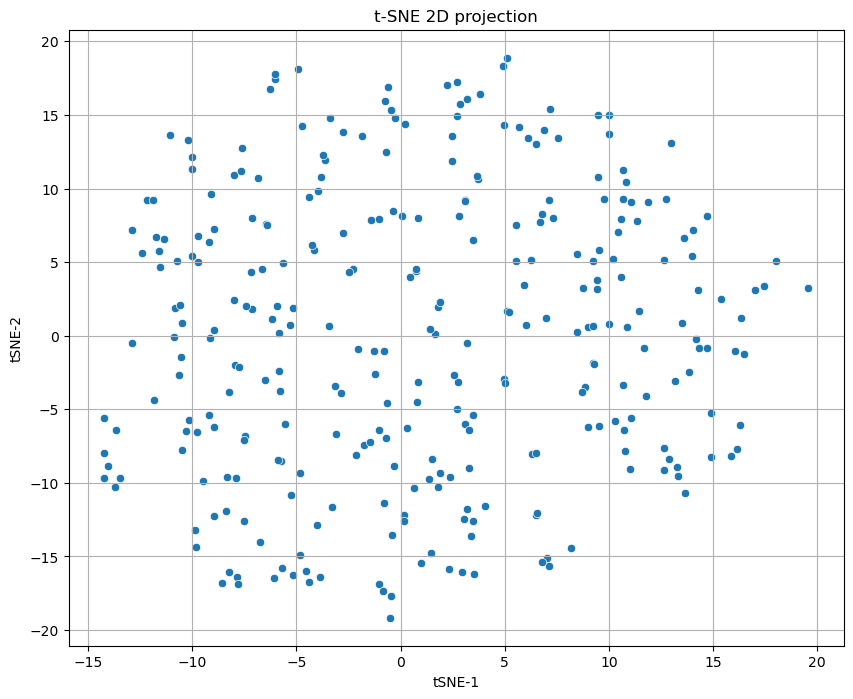 This scatter plot shows the result of t-SNE, a nonlinear dimension reduction technique used to project high-dimensional data into two dimensions for easier visualization. In this case, we intentionally dropped the original “cluster” labels to allow t-SNE to form its own structure without prior knowledge of existing groupings. As a result, the graph appears less clearly clustered compared to groups that included cluster labels during projection. This approach helps reveal natural structure and similarity in the data based purely on feature relationships, though the absence of cluster supervision may lead to a more diffuse, spread-out visualization.